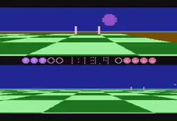 Ballblazer is a simple one-on-one sports-style game bearing similarities to basketball and soccer.[5] Each side is represented by a craft called a "rotofoil",[5] which can be controlled by either a human player or a computer-controlled "droid" with ten levels of difficulty. The game allows for human vs. human, human vs. droid, and droid vs. droid matches. The basic objective of the game is to score points by either firing or carrying a floating ball into the opponent's goal. The game takes place on a flat, checkerboard playfield, and each player's half of the screen is presented from a first-person perspective.[5]
