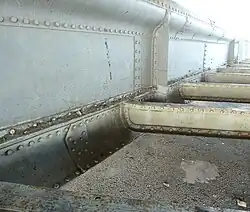 As the bridge was for a light roadway and did not have to carry the weight of a railway or train, its girders were of a lightweight construction that simplified manufacture. A full balloon upper flange was used, similar in shape to the South Wales Railway bridges, but the flange sat above the main web of the girder and the web did not span the flange and reach to the top. This simplified construction as it avoided the T-joint, the necessary L-strips and thus several rows of riveting.[10]