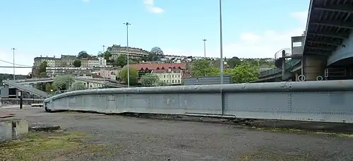 When Brunel rebuilt the entrance locks of the Cumberland Basin in Bristol Harbour, between 1848 and 1849, he also constructed a 'swivel bridge' – Brunel's first moving bridge.[10] This was of centre-pivot construction, but were highly asymmetrical, the outboard side being nearly three times longer than the landward, balanced by a large cast-iron counterweight.[10]