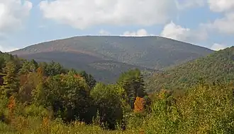 Balsam's slopes are covered with typical forestation for their elevations in the Catskills. Northern hardwoods, primarily beech, birch and maple species, predominate, with some occasional cherry and mountain ash.[9] Southern species such as oaks, isolated American chestnuts that survived the blight, shagbark hickory and dogwoods are located close to streams near the base.[10] The northern hardwood species become more stunted and dwarfed at higher elevations, more so on the ridges. On the mountain's summit, boreal species such as balsam fir and red spruce make an appearance, forming some small stands but not a continuous cover as is seen on higher peaks in the range. Around 1970, Catskill forest historian Michael Kudish found the few remaining trees in a fir stand at 3,150 feet (960 m) on the north slope; these have since all died due to heavy deer browse.[11] A large stand of tall hemlock is located in Mine Hollow[12] around 2,400 feet (730 m).[11]