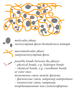 The structure of Baltic amber (succinite) is complex. It is not a polymer, because it is not composed of a repeating pattern of mers of the same type. Rather it has a macromolecular structure arranged in a crosslinked network, in which the pores (free spaces) are filled by components of molecular structure (e.g. by mono- and sesquiterpenes). Thus the chemical structure of the amber may be described as a supramolecule.[8] The structure makes the amber denser, harder and more resistant to external factors. It also makes possible good preservation of plant and animal inclusions.[9]