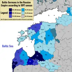 The Baltic German population never surpassed more than 10% of the total population.[5] In 1881, there were 180,000 Baltic Germans in Russia's Baltic provinces; however, by 1914, this number had declined to 162,000.[6] In 1881 there were approximately 46,700 Germans in Estonia (5.3% of the population).[7] According to the Russian Empire Census of 1897, there were 120,191 Germans in Latvia, or 6.2% of the population.[8]