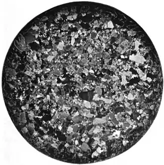 The augen gneiss member consists of two belts of fine to medium grained gneiss bearing biotite, microcline, quartz, and plagioclase, with abundant large ovoids (augen) consisting of microcline and/or quartz.[1]