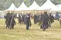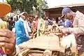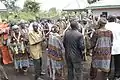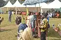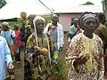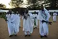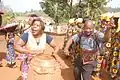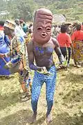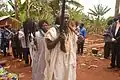 During the colonial period, parts of the Bamileke region adopted Christianity, though some of them practice Islam. Today, the dominant form of worship is still ancestral with most Bamileke practicing Veneration of the dead.[16] Death is always met with mystery, and the family is required to turn the body over to an examiner to determine the cause of death. After this is completed, the family must gather at the home. Each member must step up to the totem and swear that they were not involved in the death of the loved one. It is believed that if someone in the room really is the murderer, the totem will trap their spirit forever. To satisfy the Ancestors, the person believed to be a murderer must perform a special ritual that consists of the pouring out of libation during the burial ceremony. The family will then gather the wet earth and shape it into a circle. This is seen as a metaphorical skull of the deceased, blessed by libation.[17]