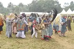 The Bamileke are known for elaborate elephant masks used in dance ceremonies or funerals to show the importance of the deceased person. During the homegoing celebration of King Njoya's mother in 1913, elephant masks were worn by those in attendance.[17]