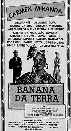 Banana da Terra (English: Banana of the Land) is a 1939 Brazilian musical film directed by Ruy Costa and written by Braguinha and Mário Lago.[1] The film stars Carmen Miranda, Dircinha Batista, and Aloysio de Oliveira. It was Miranda's last film in Brazil, before she moved to Hollywood.[2]