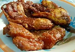 Vazhakkappam or pazham pori (Malayalam: പഴം പൊരി), also known as ethakka appam, is a fritter food with ripened banana or plantain[6] and maida flour. A popular food item in South Indian cuisines, especially in Kerala, it is generally eaten as a breakfast or a snack.[6][7] It is called as balekayi bajji (ಬಾಳೆಕಾಯಿ ಬಜ್ಜಿ) in Kannada, vazhakkay bajji in Tamil, and aratikaya bajji (అరటికాయ బజ్జి) in Telugu.