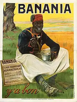 This brand of chocolate drink is recognized by its trademark the 'bonhomme Banania': a black man wearing a fez.[4] The company started using this illustration in 1915.[5]