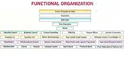 The university is governed as per the procedures laid out in the Banaras Hindu University Act of 1915 (BHU Act), and statutes of the university.[73] The executive council is the supreme executive governing body of the university and exercises all the powers on management and administration of the revenue, property, and administrative affairs of the university. The University Court is the supreme advisory body to the Visitor for all matters not otherwise provided for by the Banaras Hindu University Act, and the statutes.[74] The Academic Council is the highest academic body of the university and is responsible for the maintenance of standards of instruction, education and examination within the university.[75] It has the right to advise the executive council on all academic matters. The finance committee is responsible for recommending financial policies, goals, and budgets.[76]