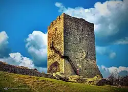 Royal charters from the 14th century evidence that Vlachs (or Romanians) were present in Banat.[167] The first recorded place name of Romanian origin[note 16] was mentioned on a list of the Telegdis' villages in Arad County in 1337.[168] By the end of the century, a dozen Vlach districts[note 17] were mentioned in Banat.[146][169] The Vlachs' local leaders, who were titled either as knezes or voivodes, were mentioned from around 1350.[146] Their residences and the Orthodox churches built in their estates can archaeologically be documented from the same century.[170] At Reșița a dwelling tower was erected on a hill, at Berzovia a wooden manor was built on a hill near the Bârzava River in the second half of the century.[171] Written sources do not reveal which Orthodox bishopric had jurisdiction over the Orthodox parishes in Banat.[172]
