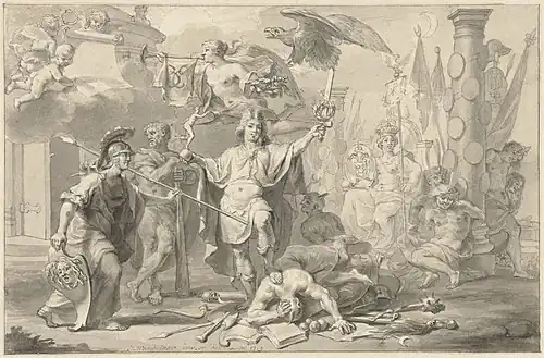 As early as March 1716, the Austrians could count on support from an inner faction of Wallachian boyars. Formed around Spătar Radu Leurdeanu Golescu, it regarded Mavrocordatos as a "tyrant".[12] Answering to boyar requests for help, the Habsburg general Stephan von Steinville sent in some hundreds of his soldiers, which, also in August 1716, routed a 3,000-strong Wallachian army at Orșova—according to chronicler Radu Popescu, these troops were secretly opposed to Mavrocordatos, and did not put up a fight. Oltenia was taken whole when the Wallachian Serdar, Cornea Brăiloiu, defected to the enemy, guiding more Austrian troops through the Vulcan Pass and into Târgu Jiu.[13] Some Oltenian boyars were soon co-opted by Prince Eugene of Savoy and his invasion force: Postelnic Ștefan Pârșcoveanu led 200 Habsburg soldiers in battle against the Mavrocordatos troops, at Bengești-Ciocadia.[14] An Austrian force under Stephan Dettine von Pivoda ventured out of Oltenia and into Pitești, then took the Wallachian capital, Bucharest on 14 November, capturing the Prince; during this episode, most Wallachian forces had been diverted to Oltenia, with Popescu invested as Ban.[15] Despite earning support from the Wallachian assembly, which declared itself subject to Emperor Charles VI on 28 November, the Austrians were not confident about establishing a bridgehead in Muntenia, and withdrew immediately after to Mărgineni and Câmpulung.[16]