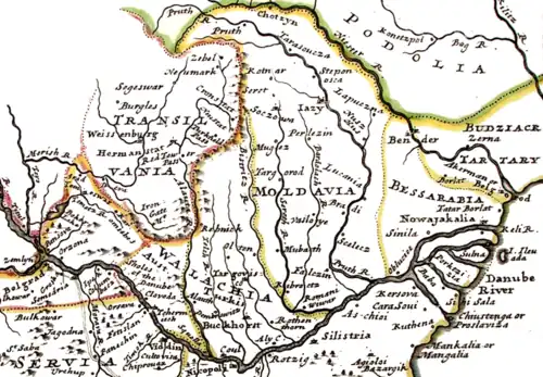 The autonomous Banship of Craiova covered a quadrilateral western third of Wallachia, located between the Southern Carpathians to the north, the Danube to the south and west, and the Olt River (Alutus in Latin; hence "Cisalutanian") to the east. Since the 15th century, Wallachia, including its Oltenian subdivision, had been subjugated by the Ottoman Empire (its neighbor to the south), participating as such in the Ottoman–Habsburg wars. During the 17th century, members of the Wallachian boyardom, especially those linked with the Cantacuzino family, began looking to the Habsburgs as potential liberators of the country.[2] The period included several episodes in which Wallachia was declared a Habsburg fief. One such early case was on 7 January 1543, when Radu Paisie, the Prince of Wallachia, nominally attached his country to the Habsburg Kingdom of Hungary.[3] In June 1598, during an episodic emancipation from Ottoman vassalage, Prince Michael the Brave and his Postelnic Andronic Cantacuzino (both of whom had served as Bans) submitted Wallachia to the Holy Roman Empire.[4] The Great Turkish War of 1683 saw Prince Șerban Cantacuzino and his Wallachian military forces fighting on the Ottoman side; however, they made a public show of their reluctance, and privately celebrated Habsburg Austria's victory in the Battle of Vienna.[5]