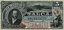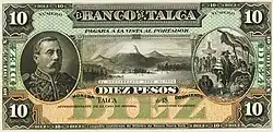 On October 27, 1885, it opened his first branch in Cauquenes, later opening branches in Parral (September 1, 1888) and Linares (January 27, 1890).[4][5] Like several banks of that time in Chile, Banco de Talca issued its own money, which was made through the printing of 5, 10, 20 and 100 peso notes; the first 5, 10 and 100 peso issues (made in 1885) included portraits of generals of the War of the Pacific, Benjamín Vicuña Mackenna and José Francisco Vergara, while the 20 pesos banknotes (made in 1888) carried the portrait of Tomás Marín de Poveda, founder of the city.[1]