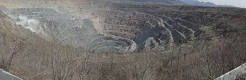 Banded iron formation was first discovered in northern Michigan in 1844, and mining of these deposits prompted the earliest studies of BIFs, such as those of Charles R. Van Hise and Charles Kenneth Leith.[5] Iron mining operations on the Mesabi and Cuyuna Ranges evolved into enormous open pit mines, where steam shovels and other industrial machines could remove massive amounts of ore. Initially the mines exploited large beds of hematite and goethite weathered out of the banded iron formations, and some 2,500,000,000 t (2.5×109 long tons; 2.8×109 short tons) of this "natural ore" had been extracted by 1980.[61] By 1956, large-scale commercial production from the BIF itself began at the Peter Mitchell Mine near Babbitt, Minnesota.[62] Production in Minnesota was 40,000,000 t (39,000,000 long tons; 44,000,000 short tons) of ore concentrate per year in 2016, which is about 75% of total U.S. production.[61] Magnetite-rich banded iron formation, known locally as taconite, is ground to a powder, and the magnetite is separated with powerful magnets and pelletized for shipment and smelting.[63]
