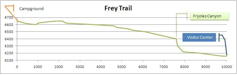 Prior to the construction of the modern entrance road, the Frey Trail was the only access to the canyon. Originally, the parking lot was at the canyon rim. Today, the trail starts at the campground amphitheater. The trail is 1.5 miles (2.4 km) one way. There is an elevation change of 550 feet (170 m).[15]