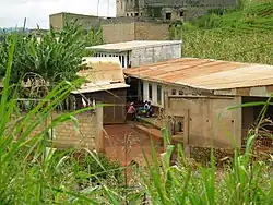 Barthelemy Toguo is a Cameroonian multidisciplinary artist who constructed the Bandjoun Station between the cities of Bandjoun and Bafoussam in Western Cameroon. The station was built over the course of two years, starting in 2005 and opening in 2007. It includes an exhibition space, a library, an artist residency, and an organic farm.[4] It was made to foster contemporary art and culture within the local community. The station is composed of two distinct buildings divided into different centers that are used for multiple purposes. The main building is designed with five armed concrete pillars and topped with a ten meter high gable; this sloped roof respects the traditional architecture or the area.[5] The exterior of the buildings are covered in bright colorful patterns and mosaics that are derived from Toguo's own artwork. Being that the station is in this particular location it is able to welcome all sorts of traditions. People are invited to appropriate this space, to organize festivals for or related to their culture such as burials, births, and even weddings. It is all done in hopes to create social cohesion within the community.[6]