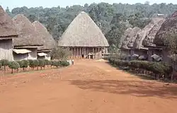 The structure of the chiefdom resembles to the huts of the nobles with a peaked roof and number of points depending on the hierarchy. The main entrance leads to the large hut and the women's huts are located on both sides of the path. Women on one side are led by the first wife, who is also called "Nkoung", and those on the other side by "Djuikam", the wife of the King's predecessor who he takes during initiation.