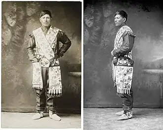 A bandolier bag may be worn either across the shoulder to the side or in front like an apron.[1][2] Men wore them and placed valuables such as tobacco, pipes, medicine, or flint for starting fires.