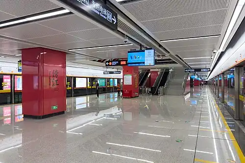 Bangjiang Station (Chinese: 傍江站; Cantonese Yale: Pǎnggōng Zaahm) is a station of Line 3 of the Guangzhou Metro. It started operations on 1 November 2024, along with the rest of the eastern extension of Line 3.[1] It is located at the underground of the junction of Yayun Boulevard[2] and Bangyan Road,[3] in Panyu District, Guangzhou.[4]