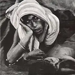 At Harrison's urging, Capitol Records, Apple's distributor in the United States, set all four of its manufacturing plants to producing copies of the "Bangla Desh" single; one-sided, white label promo discs were also rushed through to ensure immediate radio play for the song.[46] For the US picture sleeve, designer Tom Wilkes chose a suitably topical image, incorporating headlines and text from New York Times articles about the Bangladesh crisis.[46] The articles made mention of vultures being the "happiest creatures" amid the chaos in Dacca, and India's "wait and see" policy regarding events in East Pakistan.[65][nb 3] The front of the picture sleeve was topped with the line "(We've Got to Relieve)" before the words "Bangla Desh", leading a number of publications to include the parenthetical text as part of the official song title.[22] Boxed off at the foot of the front sleeve were details of the George Harrison–Ravi Shankar Special Emergency Relief Fund (care of UNICEF's New York headquarters), to which proceeds of the single would go and further donations were encouraged.[22][67] The back cover of the US sleeve was taken from a UPI news agency photograph – an "emotional" image showing a mother comforting her starving child.[46] This photo was also used in the aid project's magazine advertising campaign.[68]