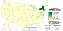 There are 272,338 Bangladeshi in the country,[20] whereas 256,681 of them are reported as Bangladeshi origin and the rest are reported as mixed.[21] Bangladeshi Americans are largely concentrated in metropolitan areas in the Northeast, Mid-Atlantic, and Great Lakes regions of the country, especially working-class neighborhoods and suburbs. There are smaller concentrations in states such as Texas, California, and Nevada.[22]