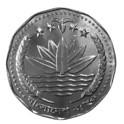 Until Bangladesh Liberation War in 1971, the Pakistani rupee was the currency of the country. After the independence of Bangladesh, the first Bangladeshi currency was issued on March 4, 1972.[1] The government currency was named taka, later "৳" was designated as the sign or symbol of Taka. The minimum unit of money fixed is one rupee. And a percentage of money is called Paisa. That is, ৳1 is equal to 100 paise. In 1973, 5 paisa, 10 paisa, 25 paisa and 50 paisa started circulation.[1][2]