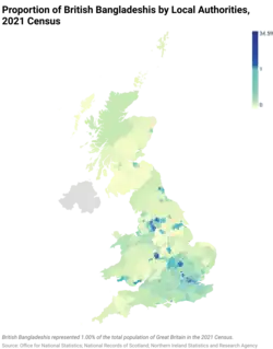 ![]() Distribution of British Bangladeshis by local authority in Great Britain, 2021 census | |