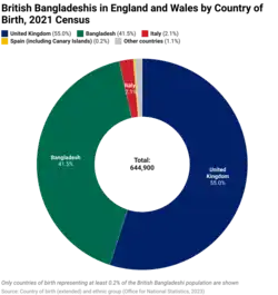 Bangladeshis in the UK are largely a young population, heavily concentrated in London's inner boroughs. In the 2011 Census 451,529 UK residents specified their ethnicity as Bangladeshi, forming 0.7% of the total population.[52] In the 2021 census, there were a total of 652,535 Bangladeshis in the United Kingdom, forming just under 1% of the total population.[1][2][3]
