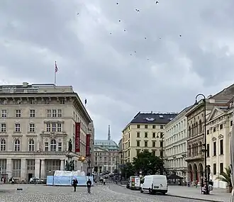 View of the Freyung towards Am Hof in Vienna, with, from left to right, the former head offices of Creditanstalt, Niederösterreichische Escompte-Gesellschaft (later Länderbank, in the background), Anglo-Austrian Bank, and Austro-Hungarian Bank