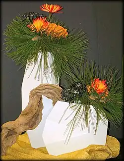 Gendaika or freestyle Banmi Shofu designs provide opportunities for using flowers, line materials, and driftwood in creative ways without the constraints of rules that govern other more classical designs.[16] However, the finished creation is not a random arrangement and massing of flowers. It takes sensitivity to forms, colors, and textures and the way that they combine into a beautiful design that touches the viewer both aesthetically and emotionally.