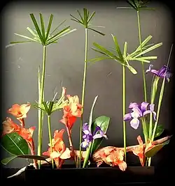 There are older, traditional plant holders that may be used or one of the following modern counterparts can be selected: Pinpoint Holder, or kenzan, which is a steel or lead block with sharp points for use with thick and soft stems; Turtle Holder, or kame-dome, which is glass, metal, or actual turtle shells with holes made for stems; Crab Holder, or kani-dome, which is comparable to Turtle Holder, but with crab instead; Whirlpool holder, or kazesui-domei, that has two oblong shapes that are attached to imitate swirling water; and Tripod, or gotoku-dome, which is used to keep a kettle over a hibachi stove.[1][6] Other plant holders include bundled straw or water lily stems, or komi-wara, which are utilized for portable arrangements, and another holder similar to komi-wara, florist oasis, which is a light foam usually used commercially.[1] A Branch Holder, or kubari; Horse-Bit Holder, or kutsuwa-dome; Circle Holder, or shippo; and Slatty Holder, or yaen-kubari, may all be used to keep the arrangement in place.[1]
