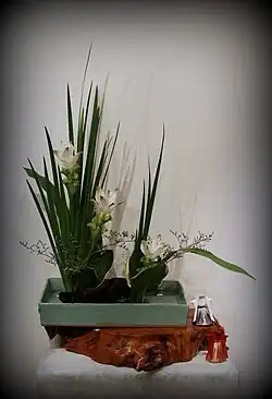 Banmi Shōfū-ryū (晩美生風流) is a school of Ikebana, an ancient Japanese art form that involves arranging flowers for spiritual purposes.[1] Ikebana accompanied Buddhism's arrival in Japan in the 6th century and evolved from a Buddhist ritual. This ritual, which started in India, consisted of throwing “floral offerings” to the spirits of those who had passed.[1] By the 10th century, containers were used for the floral offerings, slowly representing the development of Ikebana. Kado, which means “way of the flower,” is used in Ikebana practice and began to spread into more of an aesthetic than a spiritual representation during this time.[2] By the 15th century, Ikebana embodied what it is known for today, an art form with a spiritual foundation.[1] Ikebana is a way to connect with the flowers through active meditation, producing calmness and concentration for those who engage in this complex and expressional art.[1] Ikebana has also been shown to have calming physiological effects on both creators and viewers of the art.[3][4]