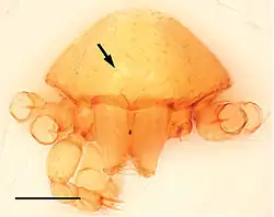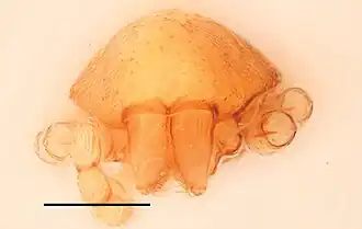 B. crassipina males are around 1.5 mm in body length (tip of the cephalothorax to end of the abdomen), while females are slightly larger at 1.8 mm. B. parvula are smaller, with males and females measuring around 1.0 and 1.1 mm, respectively. In addition to size, male B. crassispina can be distinguished from male B. parvula by the presence of two large bristles (setae) on the palpal tibiae (the penultimate segments of the pedipalps) and two rows of setae on the sternum (the ventral portion of the cephalothorax). Females can be distinguished by a relatively smaller abdominal scutum in B. crassispina.[1]