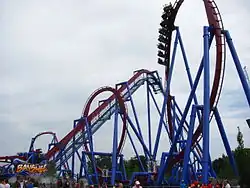 The foundation work for the supports was done by R.E. Middleton, and the rest of the ride's construction was performed by Adena Corporation.[24] The first pieces of track and supports were delivered to the park from Clermont Steel Fabricators on August 16, 2013;[7][25] the first track piece was erected on August 27, 2013.[26] The lift hill was completed on September 29, 2013,[27] and by the end of October, other elements such as the first drop, dive loop, and vertical loop were installed.[28][29] Work on the station commenced that November,[29] and the ride was 40 percent complete by the next month.[30] The final piece of track was installed on January 23, 2014.[31][32] Workers began installing the ride's trains that February,[33] and testing began on March 15.[34][35][36]