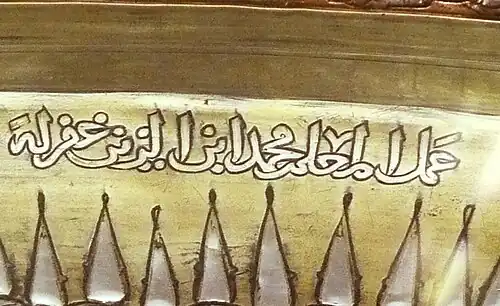 The organization of work in the workshops remains difficult to understand because of a lack of written sources. Although coppersmiths appear to sign their work more so than other artisans, they were still considered to be artisans of secondary status, unlikely to attract the attention of their contemporary scholars.[25] The Baptistery bears the signature of one person named Muhammad ibn al-Zayn, who also put his name on a smaller bowl in the Louvre.[26] LA Mayer emphasizes that some works with two signatures show that there is usually at least one artist doing the foundational work of shaping the bowl, and another, the Naqqash, was the main decorative inlayer.[27] When a name is inlaid in silver letters, it usually means that this person was the “master” and inserter. One such name is Muhammad ibn al-Zayn, Al mu'allim.[28] The use of the term al-mu'allim is found in other pieces of Mamluk inlaid metals such as a piece of furniture in the name of an-Nasir Muhammad ibn Qala'un kept at the Museum of Islamic Art in Cairo,[29] or a mirror preserved at the Topkapi Museum.[30]