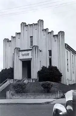 After World War I and years of depression when congregation finances were limited, a scheme to substantially renovate the church was put forward in 1937 during the pastoral term of Rev. Gray A Parker.[11]: 68–69 By the following year the remodelled church was complete,[28] its "futuristic and perpendicular" facade[29] in an Art Deco style that was popular between the world wars but unusual in churches. The front porch was completely replaced and fitted with stained glass, leadlight windows, with matching ones in the front wall, and all of the exterior walls were rendered. The interior alterations included a full-width polished timber vestibule with stained glass, leadlight windows (now removed, matching the design of other new windows in the facade and featuring an arrow and torch motif) and panelling of the vestry with polished timber. The design was completed by GB Gill, the architect for the Sunday School nearly 40 years previously, while the contractor was Mr HE Wildey. Dedication of the renovated church took place on 19 June 1938, when a number of pieces of church furniture were donated: a pulpit table, Communion chair, 2 pulpit chairs, oak hymn-board, crystal vases, pedestal and pulpit hymn book.[1][30][31]