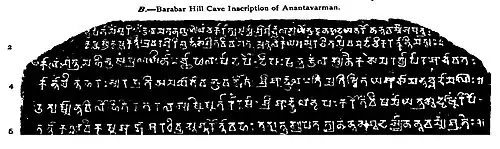 The Ashoka inscriptions in the Barabar Caves are part of Ashoka's "Minor Rock Edicts", and appear in the three caves named Sudama, Visvakarma and Karna Chopar. Lomas Rishi, meanwhile, has no Ashoka inscription (only an inscription of Anantavarman above the entrance, 5-6th century CE), perhaps because she was never completed due to structural rock slide problems.[8]