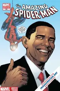 When Marvel Comics discovered the president-elect was an avid collector of Spider-Man comics, they decided to have Obama the comic book character be put on the cover of their The Amazing Spider-Man No. 583 (January 2009), for the story "Spidey Meets the President!" written by Zeb Wells. This particular release proved extremely popular and sold out in a matter of minutes.[4] A day after the release, the edition was sold for $300 on eBay. Prior to the Spider-Man story, the president-elect was featured in Secret Invasion #8; this is the first appearance of president-elect Barack Obama in a Marvel comic.