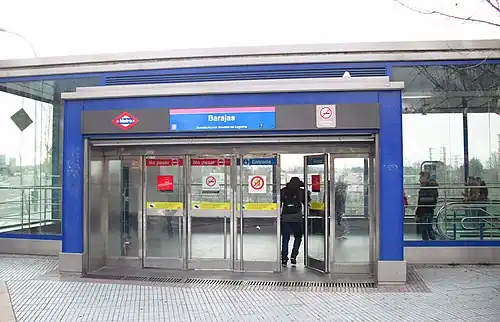 Barajas [baˈɾa.xas] is a station on Line 8 of the Madrid Metro, serving the Barajas barrio. It is located in fare Zone A.[1]