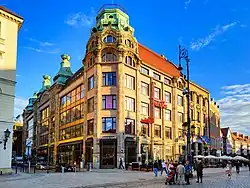 Built from 1902 to 1904 for the German Jewish merchant family Barasch by architect Georg Schneider, the store was opened on 4 October 1904. In 1929, the original Art Nouveau facade facing the market square was given a simpler, modernist look; the huge glazing above the main entrance was replaced with more conventional window rows. The large glass globe on the main tower at the corner of Ulica Szewska and Kurzy Targ (German: Hintermarkt), which had been damaged by lightning, was also removed.