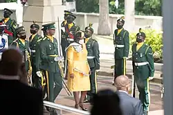 Dame Sandra Mason inspecting the Barbados Regiment at the State Opening of Parliament.