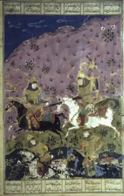 Later, the combined forces of Barbaristan and Himavarin, consisting of over two hundred elephants and a two-mile-long battle line, clash with the Persians.[21]Rustam captures and subdues key figures, including the king of Himavarin, significantly weakening the coalition. Guraza, a key Sassanid figure, captures the monarch of Barbaristan and forty chiefs.[22]