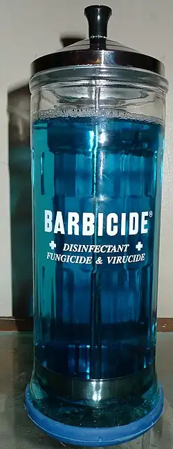 Barbicide is a United States Environmental Protection Agency–approved combination germicide, pseudomonacide, fungicide, and a viricide effective against HIV-1, hepatitis B, and hepatitis C. Its active ingredient is alkyl dimethyl benzyl ammonium chloride (5.12% by volume); sodium nitrite and blue dye are also present.[2]