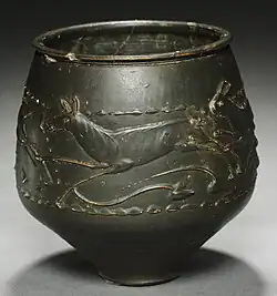 The third sense of the term describes a technique developed by Ernest Chaplet, the secret of which was later sold by him to Haviland & Co. This was a method of painting art pottery in brightly-coloured slips, in French also called peinture à la barbotine or in gouache vitrifiable. In this type there may be some impasto, but the decoration is essentially close to the surface. The term "Barbotine ware" also describes the American art pottery that emulated the Haviland pottery, which made a great impression at the 1876 Philadelphia Centennial Exposition.[5] In America this led to the technique sometimes being called "Limoges ware", Haviland being a large maker of Limoges porcelain. In fact all their barbotine wares were made at their factory in Auteuil, near Paris.[6]