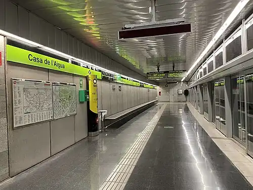 The entire segment between Trinitat Nova and Can Cuiàs opened on December 14, 2003.[6] While the line was conceived as an automated light metro extension of Line 4, it would only be in 2009 that platform screen doors were installed and automated operation began. This meant Line 11 became the second automated line of the Barcelona Metro, after Line 9.[7] However, platform screen doors were initially not installed at Trinitat Nova, as the platform was shared with Line 4. This would change in 2021, as the station's platform was extended and the services on the two lines were finally separated, with a new area with platform screen doors for Line 11.[8]