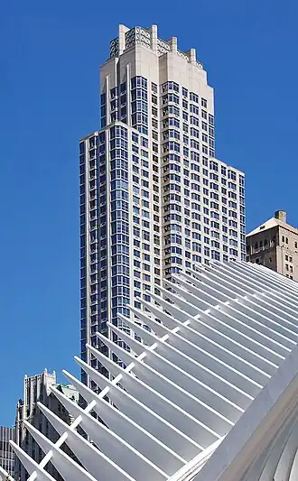 The Barclay Tower is a skyscraper located in the Tribeca neighborhood of Lower Manhattan, New York City. The residential building rises 673 feet (205 m) above street level, containing 56 floors and 441 rental units.[1][2] It is tied with One Grand Central Place as the 81st tallest building in New York. The building was erected from 2005 to 2007 and had a topping out ceremony in late 2006.[1][2]