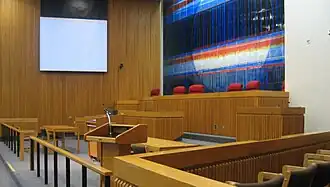 A focus of visual interest is the large (24-by-36-foot [7.3 by 11.0 m]) mosaic mounted on the wall behind the judges' bench. Designed and created by the University's Virgil Cantini, the mosaic is a dramatic compound of 126 porcelain-on-steel pieces and represents the artist's conception of the harmony of the law and the rich tapestry of the American legal system.[6] The circle symbolizes the "total process of law." The intersection of the red and blue fields at the top symbolize the opposing sides in a controversy, within the total process of law. The band across the middle of the mural symbolizes a lie detector tape and Morse Code message below read "The truth, the whole truth and nothing but the truth."