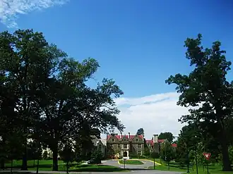 The campus of Bard College comprises 1,000 acres (400 ha) in Annandale-on-Hudson, New York. The campus, situated on the east shore of the Hudson River, offers sweeping views of the Catskill Mountains and is within the Hudson River Historic District, a National Historic Landmark. Almost all campus buildings built prior to 1950 are listed on the National Register of Historic Places as contributing features to the historic district.[1]