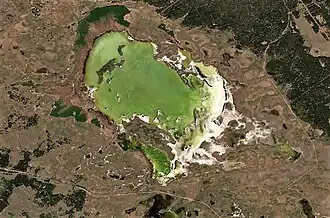 The lake has an elongated, irregular shape, stretching roughly from southeast to northwest for about 5 kilometers (3.1 mi). The eastern and northern coastlines are rocky. The remaining lakeshore sections are flat and swampy, fringed by salt marshes.[1][2][3][4]