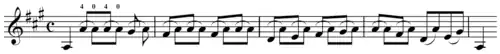 In this passage, the repeated A is played on the open A string, alternating with Fs and Es fingered on the adjacent D string. The notes on the D string (E and F natural) would be fingered as normal (first finger and low second), but the fingerings given above the second measure would be [2040 1040 2040 1040], indicating the switch (bariolage) from open A string to the stopped fourth finger on the D string, also playing the note A.